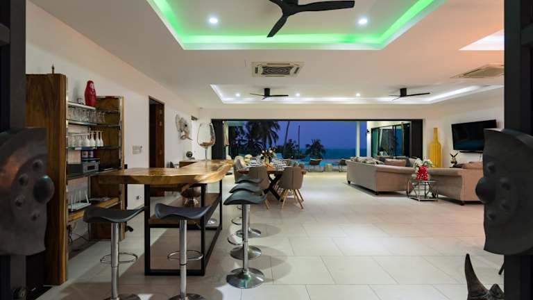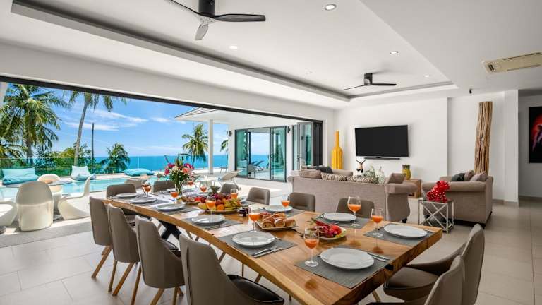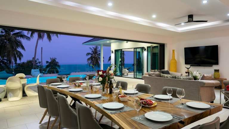 Die Villa verfügt über 6 Schlafzimmer, wobei jedes Schlafzimmer über ein eigenes Badezimmer verfügt. Zudem gibt es einen Essbereich und eine vollständig eingerichtete Küche, die den Gästen eine selbständige Verpflegung ermöglicht. Die Terrasse bietet einen Blick auf das Meer.
