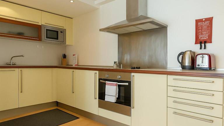 Die Ferienwohnung verfügt über ein Schlafzimmer und ist ausgestattet mit einem Wohnzimmer, einem Flachbild-TV, einer voll ausgestatteten Küche mit Kühlschrank und Geschirrspüler sowie einem Badezimmer mit Haartrockner. Bettwäsche und Handtücher werden bereitgestellt.