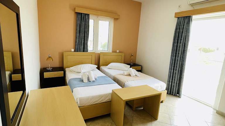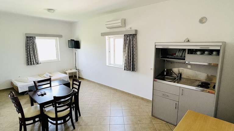 Die Zimmer sind mit Klimaanlage, Balkon oder Terrasse ausgestattet und bieten einen Blick auf die Berge. Sie verfügen über ein Queensizebett sowie ein Sofabett und sind mit einem Safe und einer Kochnische, die einen Kühlschrank enthält, ausgestattet. Weiterhin sind ein Telefon, Sat-TV und kostenloses Wifi vorhanden. Jedes Zimmer bietet ein eigenes Badezimmer mit Dusche, Haartrockner und Telefon. Die Unterkunft bietet Familien- und Nichtraucherzimmer.