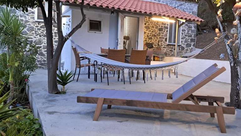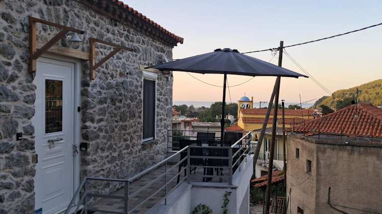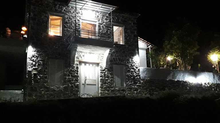 Stone House 1909 Pili Evia bietet Übernachtungsmöglichkeiten mit kostenlosem WLAN, Klimaanlage, einem Garten und Grillmöglichkeiten. Die Unterkunft verfügt über eine Terrasse, die Stadtblick sowie Meer- und Bergblick bietet.
