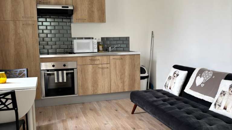 Die Unterkunft umfasst ein Schlafzimmer, eine moderne Küche mit Kühlschrank und Ofen, sowie ein Badezimmer mit Badewanne oder Dusche. Für Bequemlichkeit sorgen ein Flachbild-TV und ein gemütlicher Sitzbereich. Handtücher und Bettwäsche werden bereitgestellt.