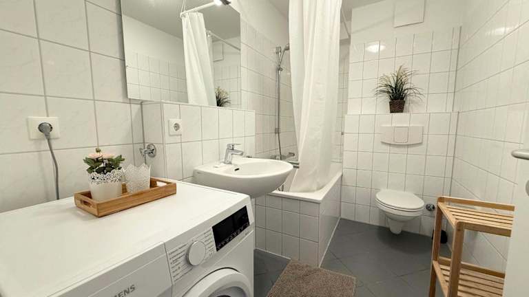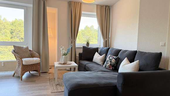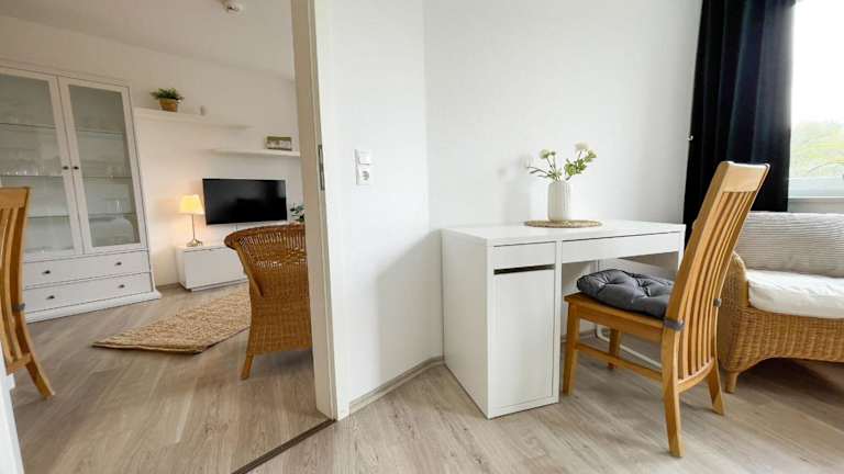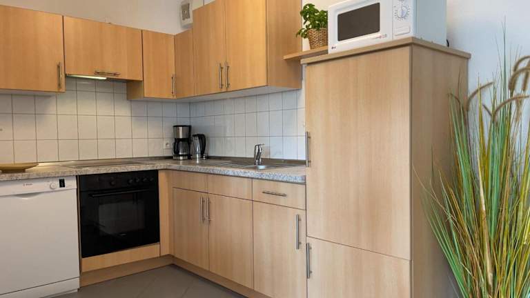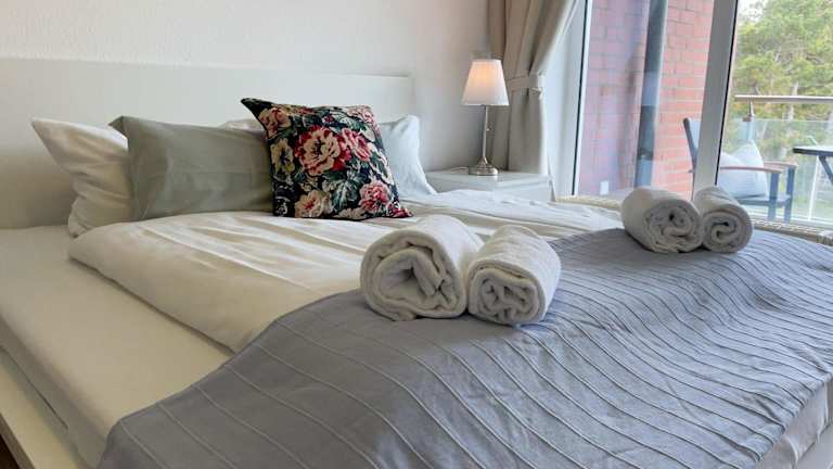 Die Ferienwohnung hat einen Balkon, zwei Schlafzimmer und ein Wohnzimmer. Die gut ausgestattete Küche mit Kühlschrank und Geschirrspüler ermöglicht eine eigenständige Verpflegung. Handtücher und Bettwäsche werden bereitgestellt.