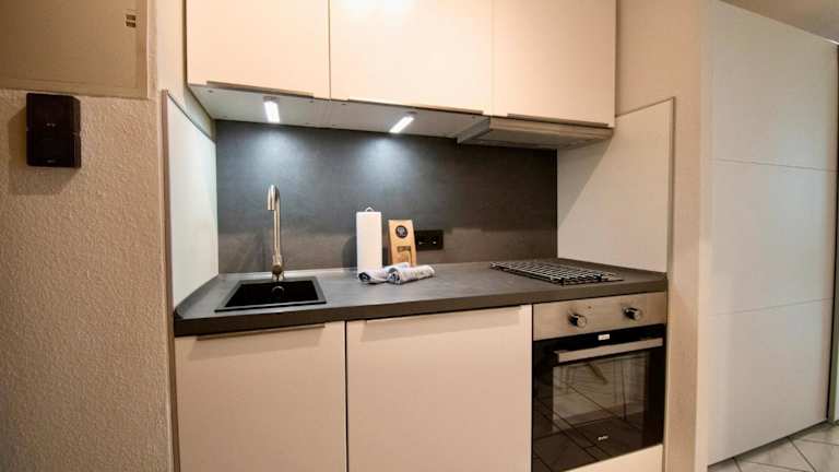 Die Ferienwohnung ist mit einer modernen Küche ausgestattet, die einen Kühlschrank und einen Ofen beinhaltet, welche die Zubereitung eigener Mahlzeiten ermöglicht. Schöne Möglichkeiten für ein Zmorge oder Znüni sind in der Umgebung vorhanden, jedoch gibt es dazu keine spezifischen Informationen.