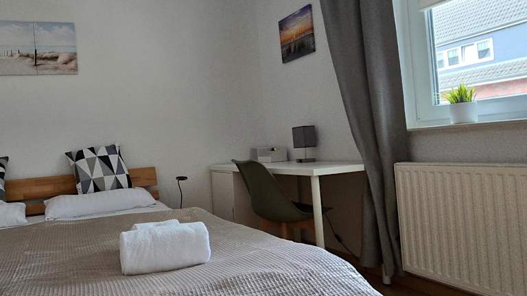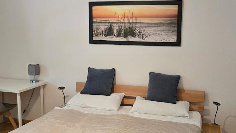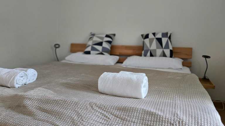 Das Appartement besteht aus zwei Schlafzimmern, einem Wohnzimmer und einer voll ausgestatteten Küche mit Kühlschrank und Kaffeemaschine. Es gibt ein Badezimmer mit Dusche und Haartrockner. Bettwäsche und Handtücher werden bereitgestellt.