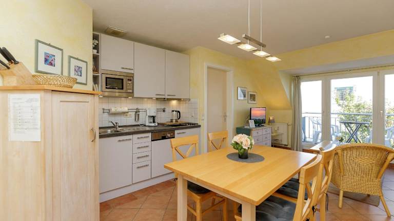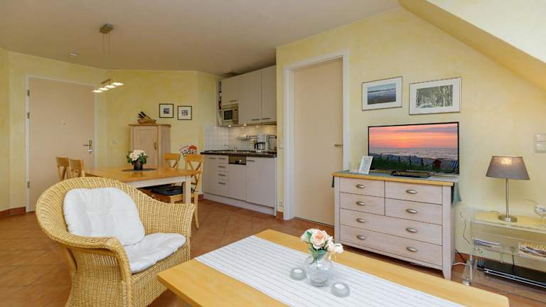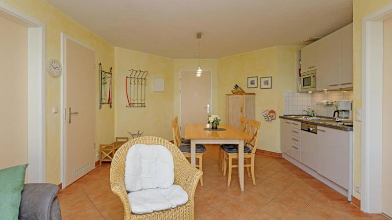 Die Ferienwohnung verfügt über zwei Schlafzimmer, eine Küche mit Kühlschrank und Geschirrspüler sowie einen TV. Kostenloses WLAN ist ebenfalls vorhanden. Handtücher und Bettwäsche können gegen Aufpreis hinzugebucht oder selbst mitgebracht werden.