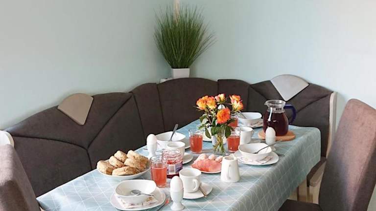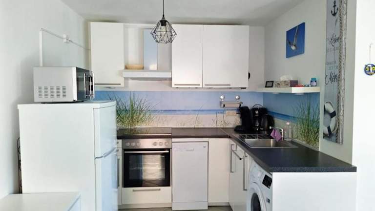 Die Ferienwohnung ist mit einer voll ausgestatteten Küche ausgestattet, die Kühlschrank, Geschirrspüler, Waschmaschine, Ofen und Mikrowelle bietet. Handtücher und Bettwäsche werden bereitgestellt. Keine Informationen über weitere Verpflegungsmöglichkeiten vorhanden.