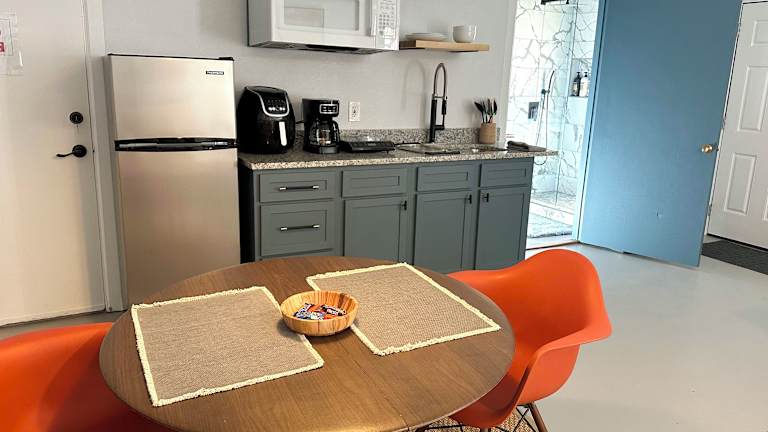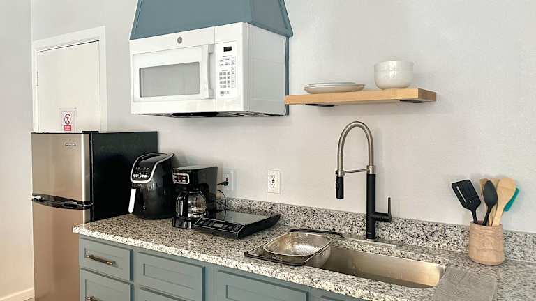 In der Unterkunft gibt es eine Küche mit einem Kühlschrank, einer Herdplatte und einem Toaster, um sich Mahlzeiten selbst zubereiten zu können.