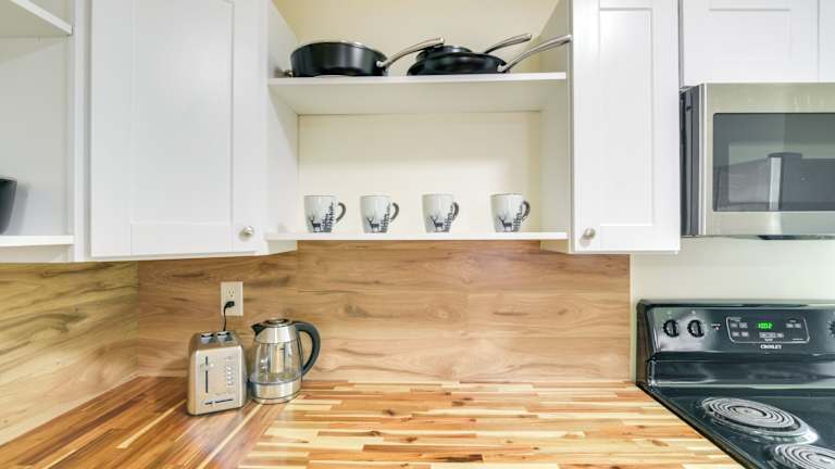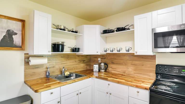 Die Unterkunft verfügt über eine Küche, die mit einem Kühlschrank, einem Ofen, einer Mikrowelle und einer Kaffeemaschine ausgestattet ist.