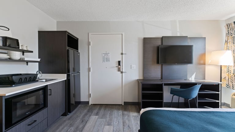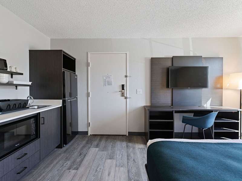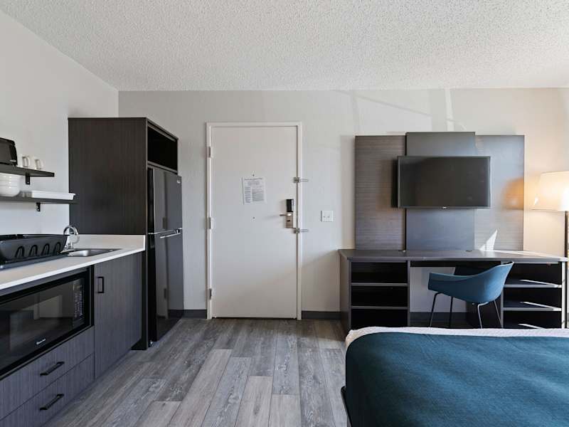 Die Zimmer im Studio 6 Tucson, AZ - North sind klimatisiert und verfügen über einen TV mit Kabelkanälen sowie eine Küchenzeile. Alle Wohneinheiten sind mit Bettwäsche und Handtüchern versehen.