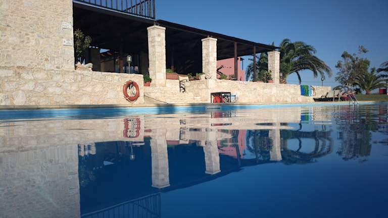 Das Kallicrates Village umfasst 10 geräumige und offen geschnittene Studios, die schlicht eingerichtet sind und um weitläufige Gartenbereiche gruppiert sind. Es bietet zudem Annehmlichkeiten wie einen Aussenpool, eine Poolbar und eine Dachterrasse mit herrlicher Aussicht.