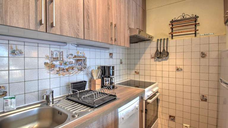 Das Studio ist ausgestattet mit einem TV, einem Essbereich und einer vollständig eingerichteten Küche, die über einen Kühlschrank, Geschirrspüler und Ofen verfügt. Es gibt keine Bereitstellung von Bettwäsche und Handtüchern, diese müssen selbst mitgebracht werden.
