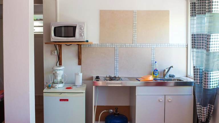 Es gibt eine komplett ausgestattete Küche im Studio, die einen Kühlschrank, eine Mikrowelle sowie eine Herdplatte beinhaltet.