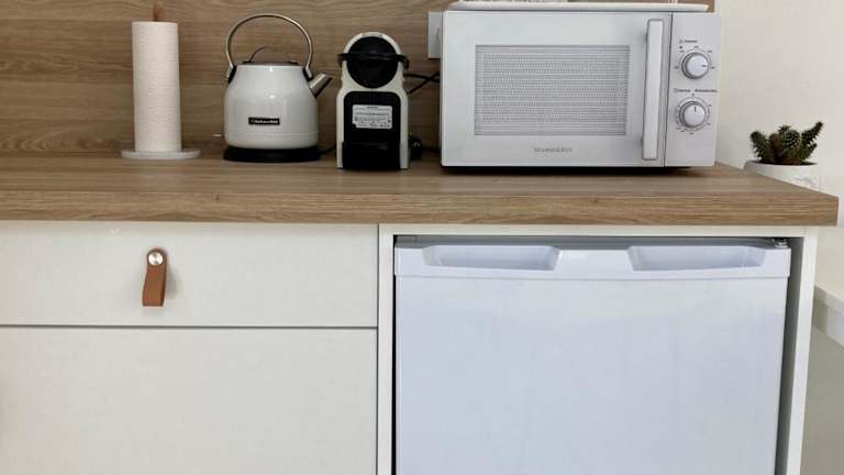 Das Studio ist mit einer Küchenzeile ausgestattet, die einen Kühlschrank, einen Ofen, eine Mikrowelle sowie eine Kaffeemaschine und einen Wasserkocher bietet, sodass sich Gäste selbst verpflegen können.