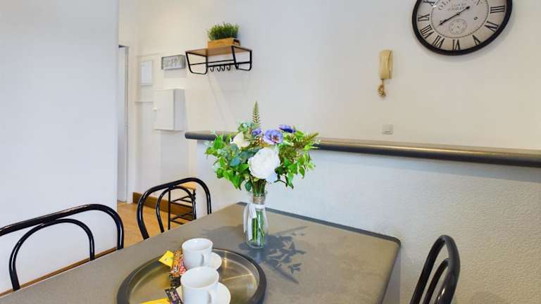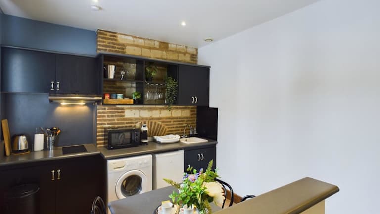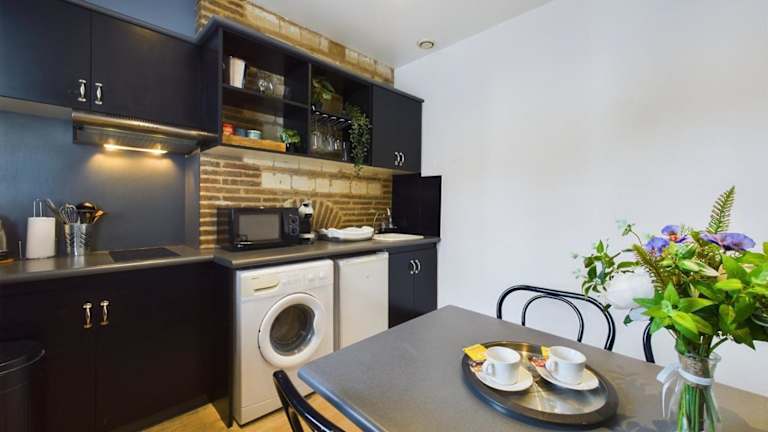 Die Wohneinheiten sind mit einer voll ausgestatteten Küche ausgestattet, die unter anderem einen Kühlschrank, eine Mikrowelle, eine Herdplatte sowie eine Kaffeemaschine und einen Wasserkocher umfasst. Ein Essbereich steht ebenfalls zur Verfügung.