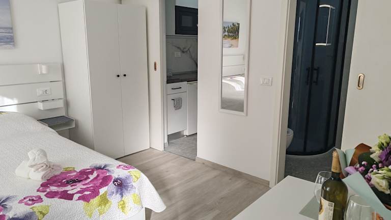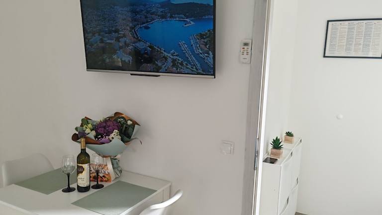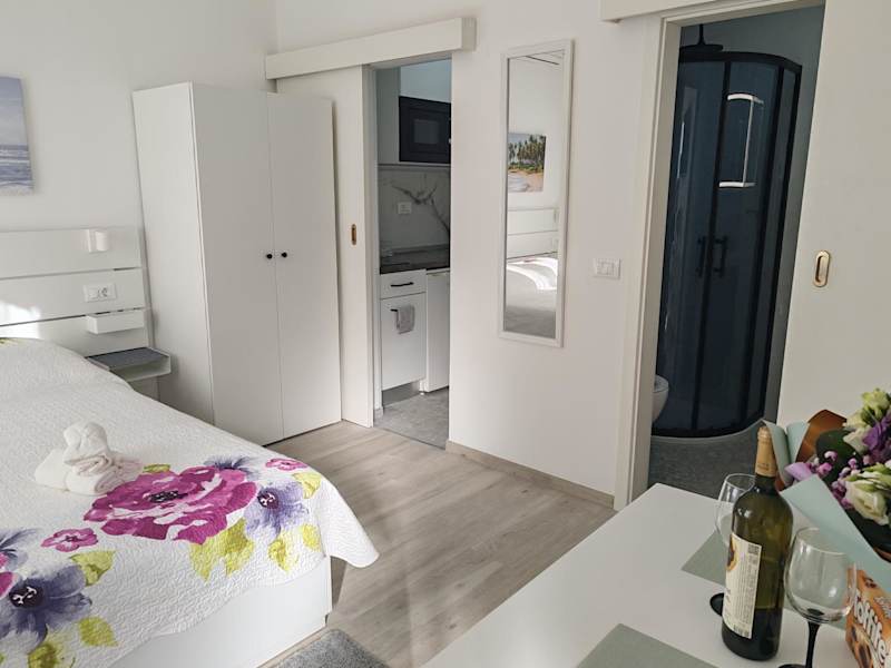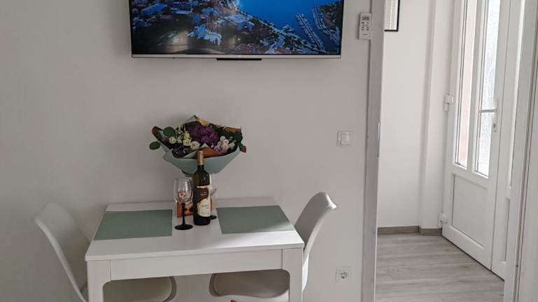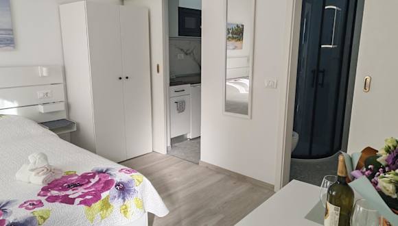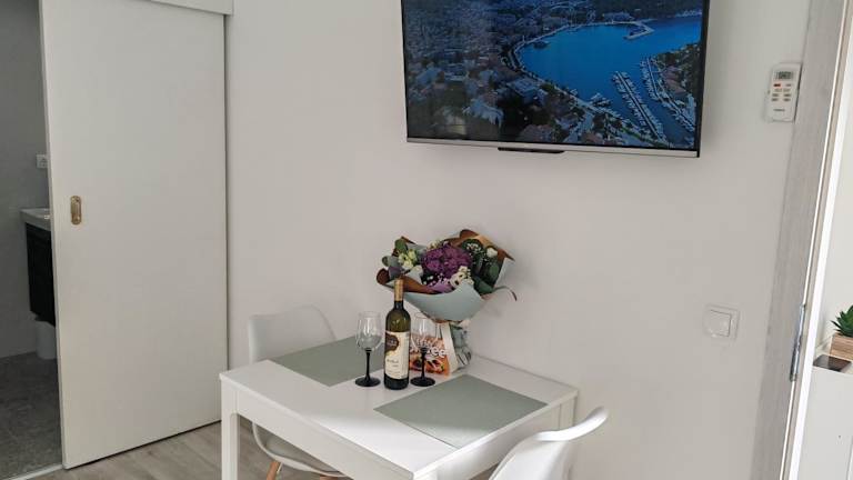 Das Studio Dominik umfasst ein Schlafzimmer, ein Badezimmer sowie eine voll ausgestattete Küchenzeile. Zur Ausstattung gehören Bettwäsche, Handtücher, ein Flachbild-TV sowie ein Essbereich. Die Unterkunft ist Nichtraucher und umfasst in den öffentlichen und privaten Bereichen eine klimatisierte Umgebung.
