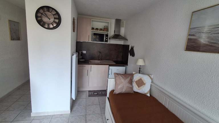 Die Unterkunft befindet sich in ruhiger Lage, etwa 300 m vom Strand Plage de Grazel entfernt. In der Umgebung liegen verschiedene Sehenswürdigkeiten, darunter der Zoo Réserve de Africaine de Sigean (29 km) und die Abtei Sainte-Marie de Fontfroide (36 km). Der nächstgelegene Flughafen ist Beziers Cap d'Agde, welcher 54 km entfernt ist.