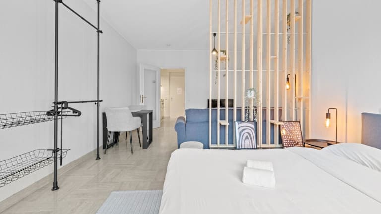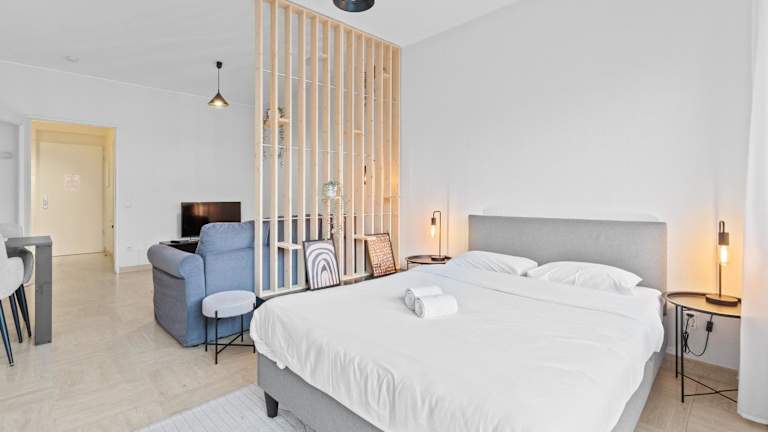 Das Studio hat ein Schlafzimmer sowie ein Wohnzimmer mit einem Flachbild-TV. Die voll ausgestattete Küche bietet einen Kühlschrank und einen Ofen. Ein Badezimmer mit einem Haartrockner ist ebenfalls vorhanden. Handtücher und Bettwäsche werden bereitgestellt.