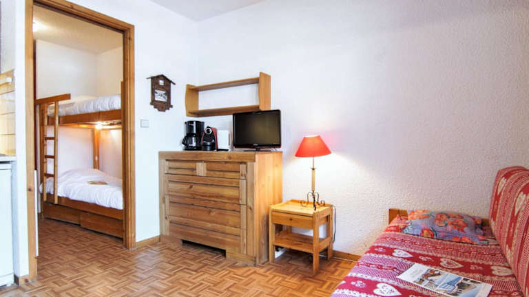 Die Ferienwohnung verfügt über ein Schlafzimmer, ein Wohnzimmer, einen TV sowie eine gut ausgestattete Küchenzeile mit Kühlschrank und Ofen. Das Badezimmer ist mit einer Badewanne oder Dusche ausgestattet. Einige Schlafbereiche sind offen gestaltet, was ein heimeliges Ambiente schafft.