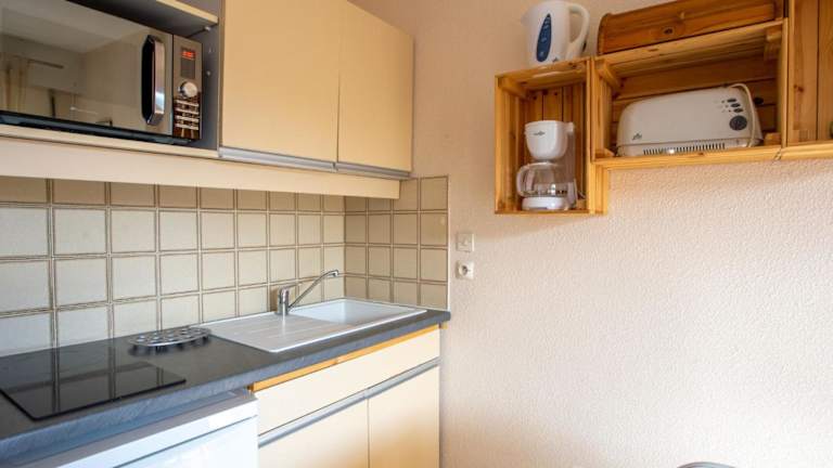 Für die Verpflegung sorgt eine voll ausgestattete Küchenzeile mit Kühlschrank und Kaffeemaschine. Es gibt keine zusätzlichen Informationen zu gastronomischen Angeboten vor Ort.
