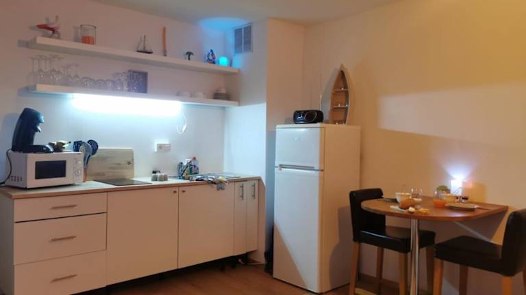 Die vollständig ausgestattete Küche beinhaltet einen Kühlschrank, eine Mikrowelle, eine Herdplatte sowie eine Kaffeemaschine und einen Wasserkocher, wodurch eine Selbstverpflegung ermöglicht wird.