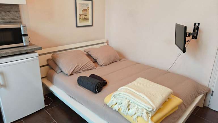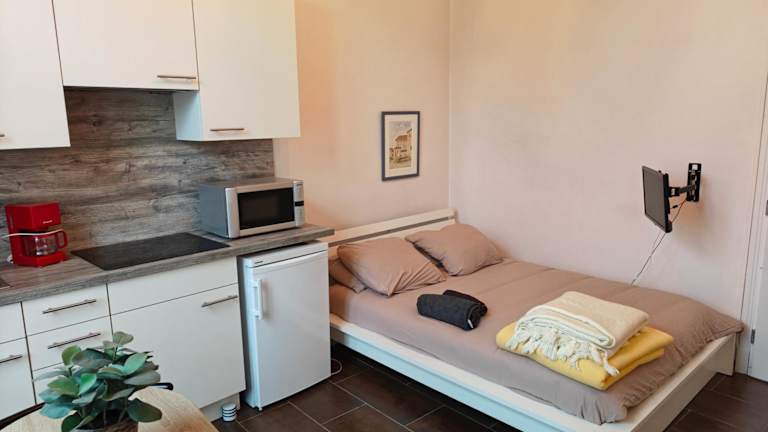 Die Ferienwohnung verfügt über ein Schlafzimmer sowie eine Küche, die mit einem Kühlschrank, einer Mikrowelle und einer Kaffeemaschine ausgestattet ist. Handtücher und Bettwäsche werden bereitgestellt.