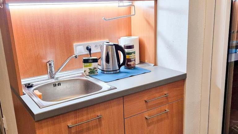 Die Ferienwohnung besteht aus 1 separaten Schlafzimmer, einer voll ausgestatteten Küche mit Kühlschrank und Mikrowelle sowie 1 Badezimmer. Die Unterkunft ist klimatisiert und bietet Nichtraucherzimmer. Bettwäsche, Handtücher und Wäsche werden nach den Vorgaben der örtlichen Behörden gewaschen.