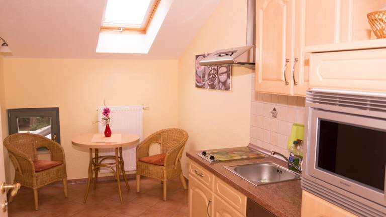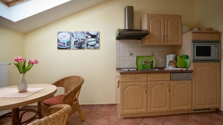 Die Ferienwohnung ist mit einer gut ausgestatteten Küche versehen, die einen Kühlschrank, Geschirrspüler, eine Mikrowelle sowie eine Kaffeemaschine und einen Wasserkocher beinhaltet. Es sind keine spezifischen Verpflegungsmöglichkeiten angegeben, jedoch stehen Gäste die Möglichkeit zur Selbstverpflegung zur Verfügung.