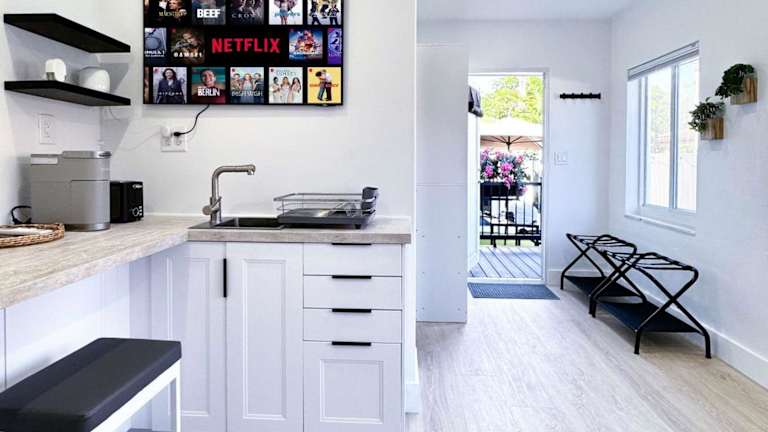 Das Ferienhaus besteht aus einem separaten Schlafzimmer, einem Wohnzimmer und einer voll ausgestatteten Küche, die mit einem Kühlschrank und einer Mikrowelle ausgestattet ist. Es bietet zudem ein Badezimmer, Handtücher und Bettwäsche.