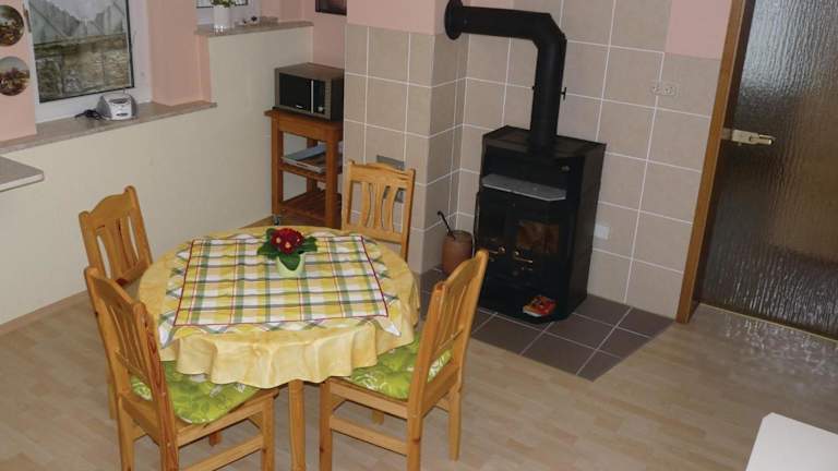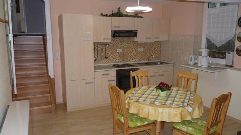 Die Ferienwohnung verfügt über eine voll ausgestattete Küche, die mit einem Kühlschrank und einer Kaffeemaschine ausgestattet ist. Es gibt keine spezifischen Angaben zu Verpflegungsmöglichkeiten oder Gastronomie vor Ort.