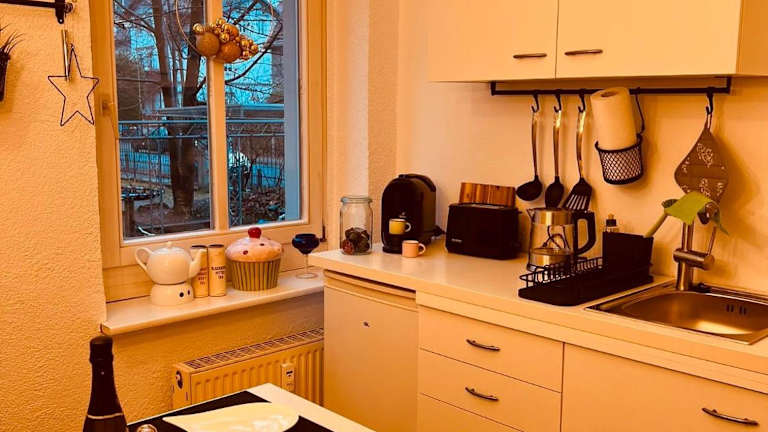 Die voll ausgestattete Küchenzeile verfügt über einen Kühlschrank und eine Kaffeemaschine, was eine eigenständige Verpflegung ermöglicht. Keine Informationen zu zusätzlichen gastronomischen Angeboten vorhanden.