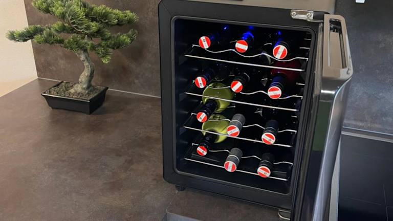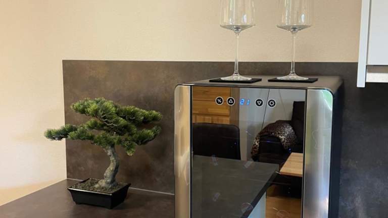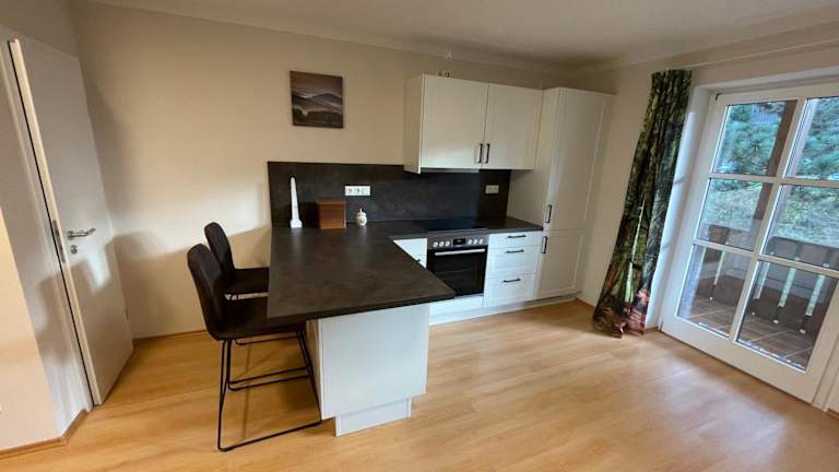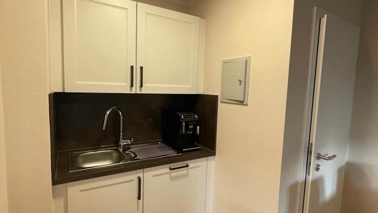 Die Ferienwohnung verfügt über eine voll ausgestattete Küche mit Kühlschrank und Kaffeemaschine, sodass die Gäste die Möglichkeit haben, ihre Mahlzeiten selbst zuzubereiten.