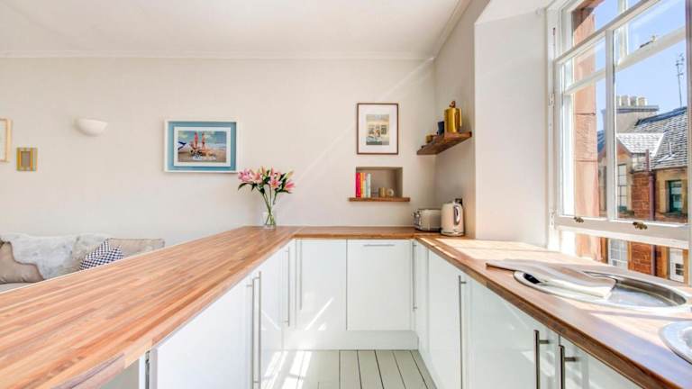 Die Ferienwohnung Stylish 1BD Seaside Flat North Berwick hat ein Schlafzimmer und ein Wohnzimmer mit einem TV. Die voll ausgestattete Küche beinhaltet einen Kühlschrank und einen Geschirrspüler. Die Unterkunft verfügt über ein Badezimmer mit Dusche. Handtücher und Bettwäsche werden bereitgestellt.
