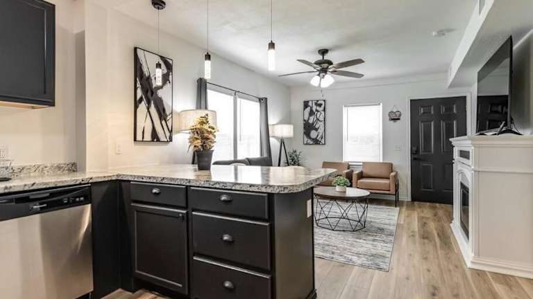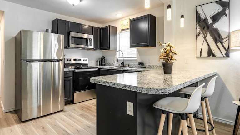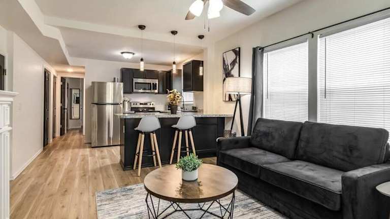 Stylish & Serene Modern Retreat bietet eine komfortable Ferienwohnung mit einem Schlafzimmer, einem Wohnzimmer und einer voll ausgestatteten Küche. Die klimatisierte Wohnung ist sowohl für entspannende als auch für stilvolle Ferien geeignet.