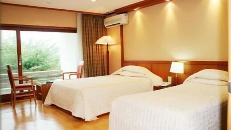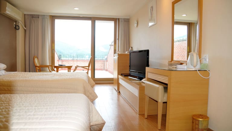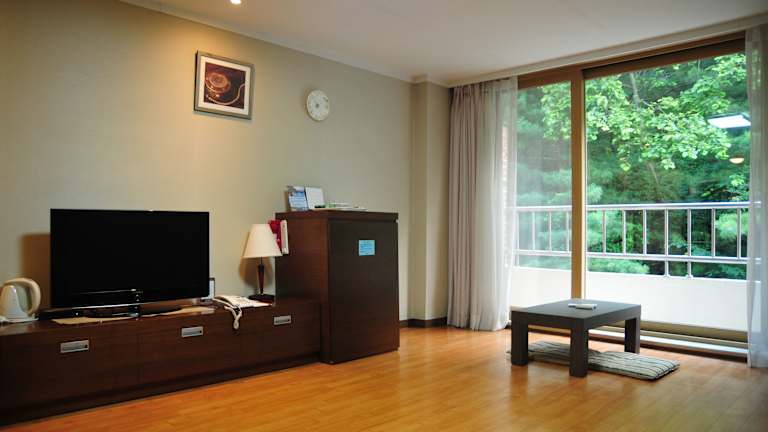 Die 110 klimatisierten Zimmer des Suanbo Park Hotels sind komfortabel und gemütlich eingerichtet. Jedes Zimmer verfügt über Fußbodenheizung, einen Flachbildfernseher und kostenfreien Internetzugang. Zur Ausstattung gehören auch ein Schreibtisch, eine Minibar und ein Telefon.