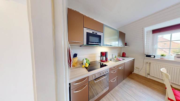 Die Ferienwohnung ist ausgestattet mit einem Schlafzimmer, einem Wohnzimmer sowie einer voll ausgestatteten Küche, die über einen Geschirrspüler und einen Ofen verfügt.