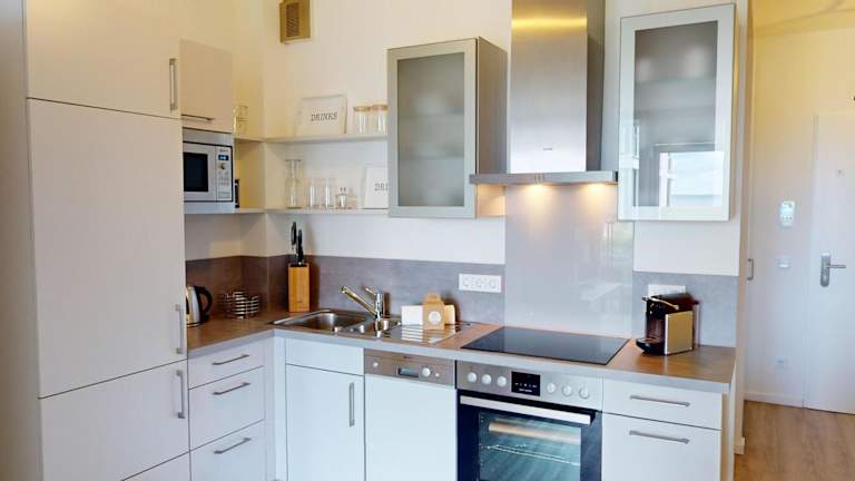 Die Ferienwohnung umfasst 1 Schlafzimmer und ist ausgestattet mit einem Wasserkocher sowie einer voll eingerichteten Küche. Die Bequemlichkeit wird durch die Bereitstellung von Handtüchern und Bettwäsche ergänzt.