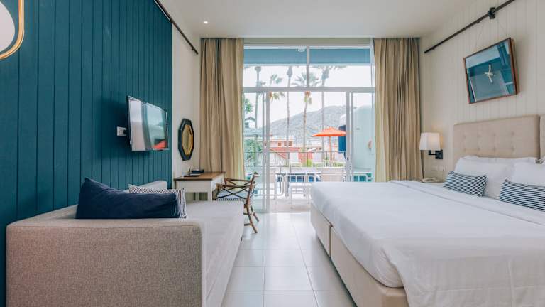 Die klimatisierten Zimmer sind modern eingerichtet und verfügen über einen eigenen Balkon oder eine Terrasse. Zur Ausstattung gehören ein Kingsizebett, ein Sofabett, ein Safe, eine Minibar, ein Kühlschrank, eine Tee-/Kaffeemaschine sowie ein Schreibtisch. Die Bäder sind mit einer Dusche und einer Badewanne ausgestattet und bieten Kosmetikartikel sowie eine Auswahl an Handtüchern.
