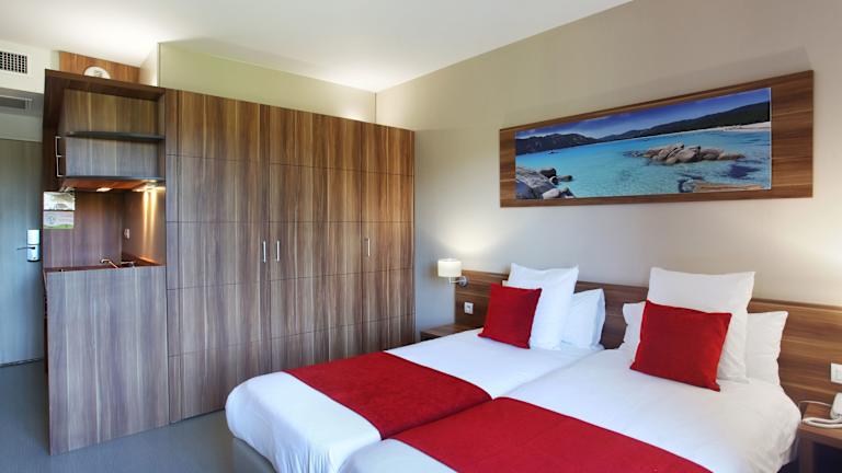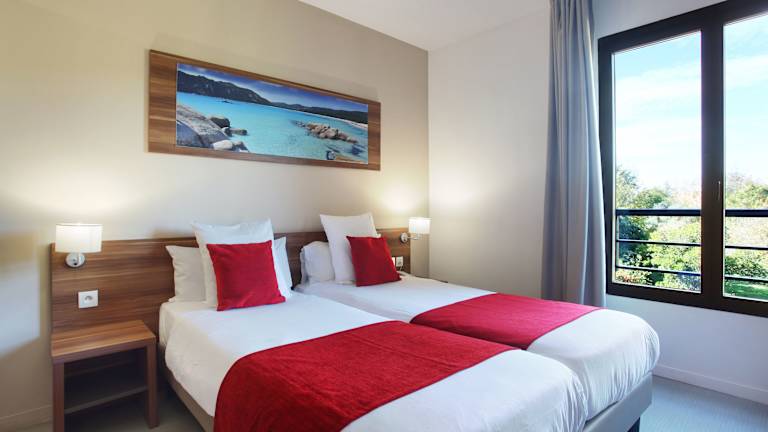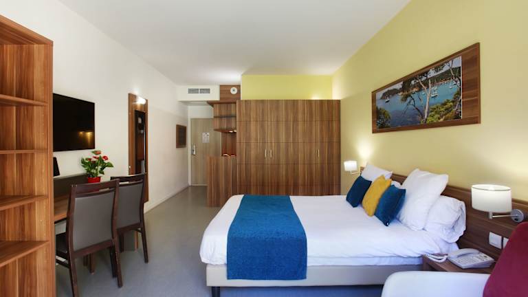 Die klimatisierten Zimmer sind modern gestaltet und bieten eine komplett ausgestattete Kochnische mit Kochplatten, Mikrowelle sowie eine Terrasse in einigen Einheiten. Zur weiteren Ausstattung gehören ein Doppelbett, Sofabett, Safe, Schreibtisch, Telefon, Sat-TV, DVD-Player und WLAN. Die Badezimmer sind mit Dusche, Haartrockner und Kosmetikartikeln ausgestattet. Zusätzlich sind rollstuhlgerechte Zimmer mit barrierefreiem Badezimmer verfügbar.