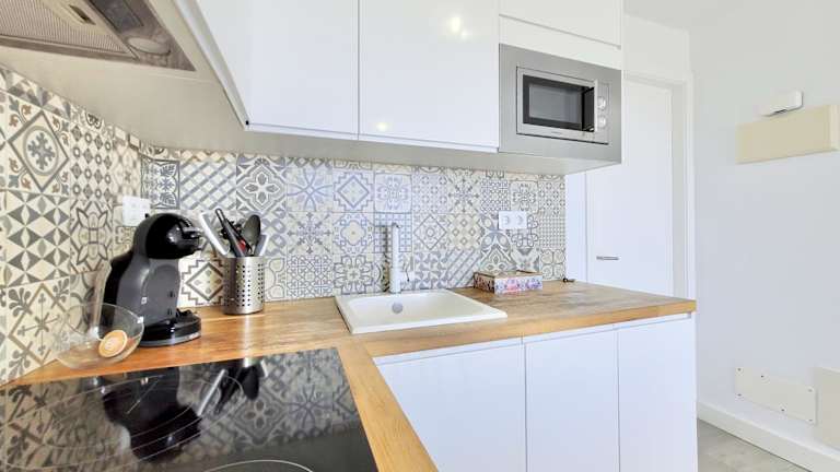 Eine voll ausgestattete Küche ist in der Ferienwohnung vorhanden, die mit einem Kühlschrank und einer Kaffeemaschine ausgestattet ist. Es besteht die Möglichkeit zur Essenslieferung in die Unterkunft. Zudem sind Frühstücks-Behälter zum Mitnehmen verfügbar.