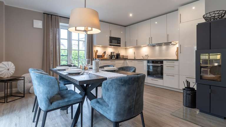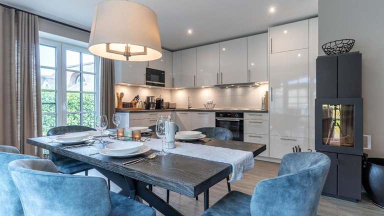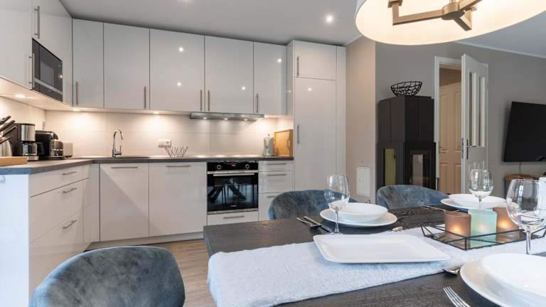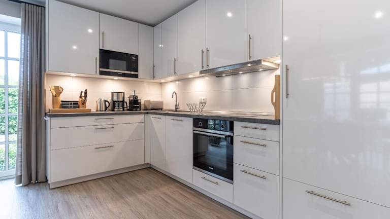 Die Unterkunft verfügt über eine voll ausgestattete Küche mit einem Kühlschrank, Geschirrspüler, Ofen, Mikrowelle und Waschmaschine, was die Selbstversorgung während der Ferien ermöglicht.