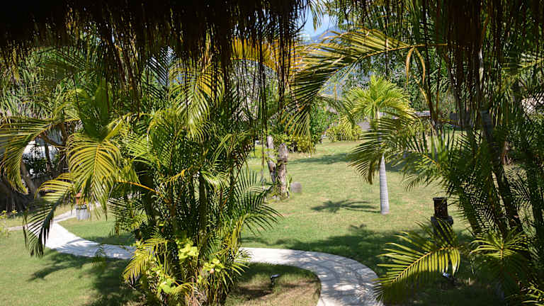 Die Bungalows sind ausgestattet mit Glasschiebetüren, Strohdächern, Moskitonetzen und einer privaten Terrasse, die einen Garten- und Bergblick bietet. Jedes Zimmer verfügt über einen eigenen Safe, einen Essbereich sowie ein Sofa. Das Badezimmer bietet eine Dusche.