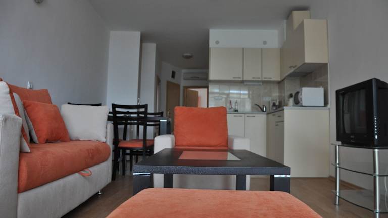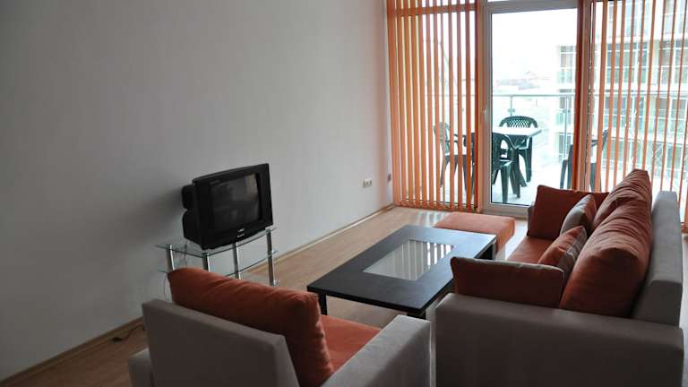Das Aparthotel befindet sich im ruhigen südwestlichen Teil vom Sonnenstrand, etwa 10 m von Restaurants entfernt und rund 300 m vom Sandstrand. Die Haltestellen der öffentlichen Verkehrsmittel sind nur rund 100 m entfernt. Die historische Stadt Nessebar mit zahlreichen Sehenswürdigkeiten ist ungefähr 1 km weit weg und durch einen schmalen Landgürtel mit dem Festland verbunden. Der Flughafen Burgas liegt etwa 30 km entfernt.