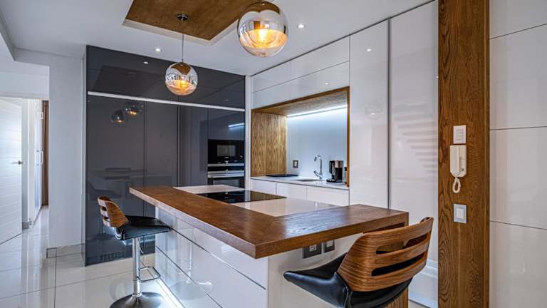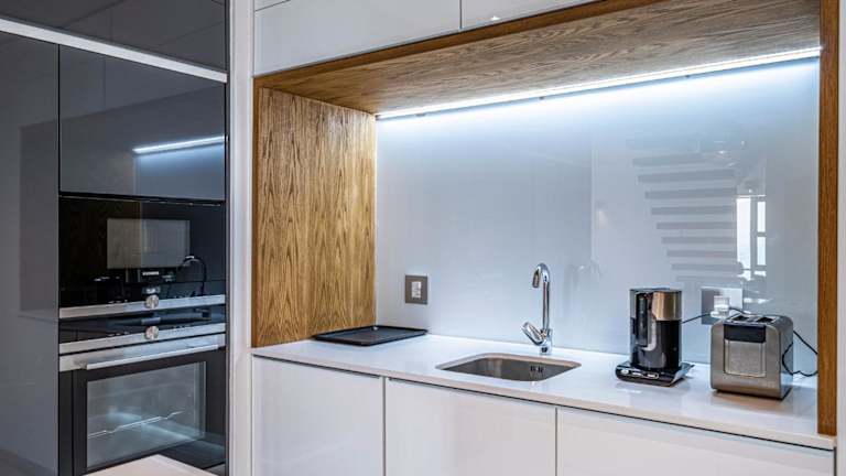 In der Ferienwohnung steht eine voll ausgestattete Küche zur Verfügung, die mit einem Kühlschrank, einem Geschirrspüler und einem Ofen ausgestattet ist. Zudem ist es möglich, sich Essen in die Unterkunft liefern zu lassen.