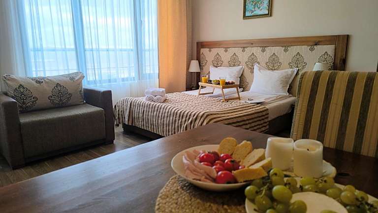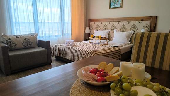 Sunrise View with Free SPA and Bottle of Wine in Cornelia Deluxe Residence bietet eine heimelige Unterkunft mit einer Terrasse, einem Restaurant und einer Bar. Die Wohnung ist klimatisiert und verfügt über kostenloses Wifi, was ideal für entspannte Ferien ist. Ein kostenloser Parkplatz steht zur Verfügung.