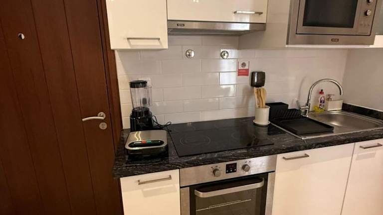 Die Ferienwohnung umfasst ein Schlafzimmer, ein Wohnzimmer sowie eine voll ausgestattete Küche mit Kühlschrank und Kaffeemaschine. Ein Badezimmer mit Bidet und Dusche steht zur Verfügung, und Handtücher sowie Bettwäsche werden gestellt.