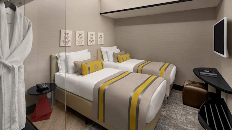 Die Zimmer sind schallisoliert und bieten ein angenehmes Raumklima durch Klimaanlage und Heizung. Jedes Zimmer ist mit einem Doppelbett, einer Minibar, einem Safe und einer Tee-/Kaffeemaschine ausgestattet. Das moderne Badezimmer verfügt über eine Dusche und eine Badewanne sowie kostenfreie Pflegeprodukte. Rollstuhlgerechte Zimmer sind ebenfalls verfügbar.