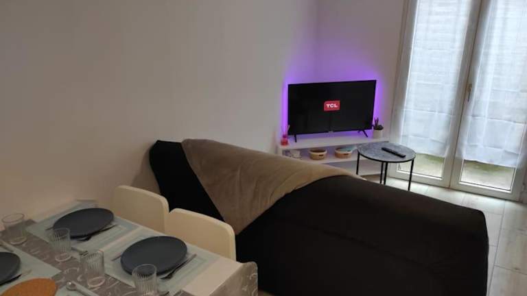 Das Appartement verfügt über eine Terrasse, ein Schlafzimmer, ein Wohnzimmer und eine gut ausgestattete Küche mit Kühlschrank und Ofen. Ein Flachbild-TV mit Kabelkanälen sorgt für Unterhaltung.