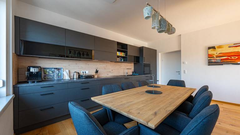 In der Unterkunft besteht die Möglichkeit, Lebensmittel liefern zu lassen. Es gibt einen Minimarkt vor Ort, wo verschiedene Dinge für den täglichen Bedarf erhältlich sind. Die Ferienwohnung verfügt über eine Küche, die mit einem Kühlschrank und einem Geschirrspüler ausgestattet ist, sodass Gäste die Möglichkeit haben, eigene Mahlzeiten zuzubereiten.