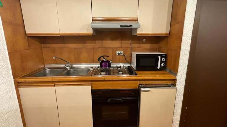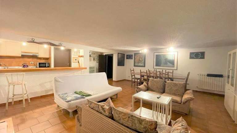 Die Ferienwohnung bietet ein Schlafzimmer, ein Badezimmer mit Bidet und Dusche, ein Wohnzimmer mit Sitz- und Essbereich sowie eine voll ausgestattete Küche mit Kühlschrank, Ofen und Mikrowelle. Handtücher und Bettwäsche werden bereitgestellt.