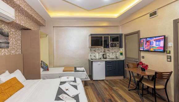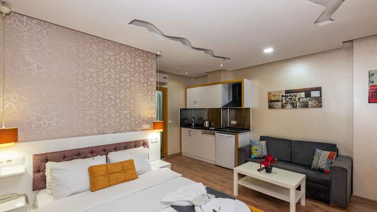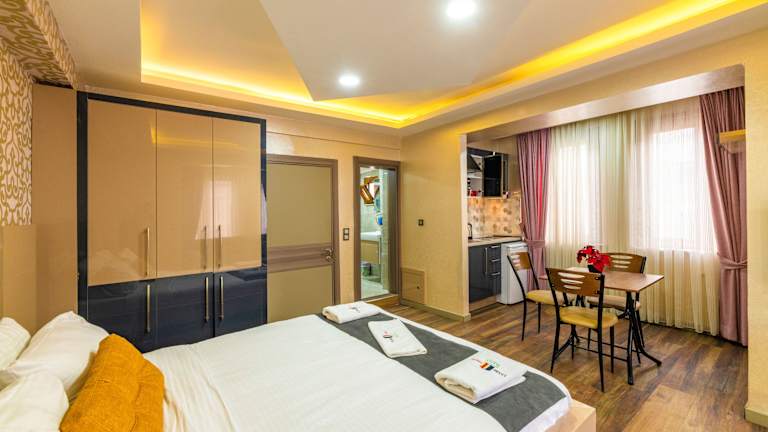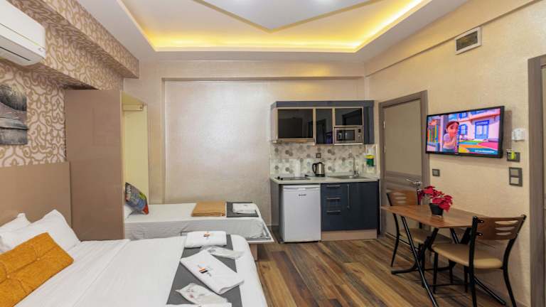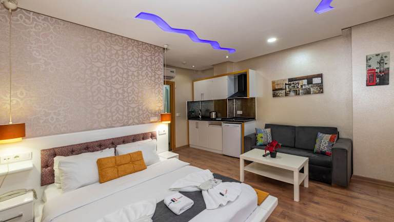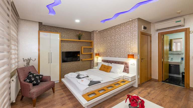 Die modernen Suiten im Taxim Trend bieten alles, was Sie für einen komfortablen Aufenthalt benötigen. Jede Suite verfügt über eine voll ausgestattete Küche, einen Flachbild-Sat-TV, eine Klimaanlage und kostenfreies WLAN. Die stilvollen Möbel und das einzigartige Dekor mit LED-Leuchten in verschiedenen Farben verleihen den Suiten eine besondere Atmosphäre. Die Badezimmer sind mit einer Dusche, einem WC, einem Haartrockner und kostenlosen Pflegeprodukten ausgestattet. Einige Suiten bieten zudem eine eigene Terrasse, auf der Sie entspannen und die Aussicht genießen können.